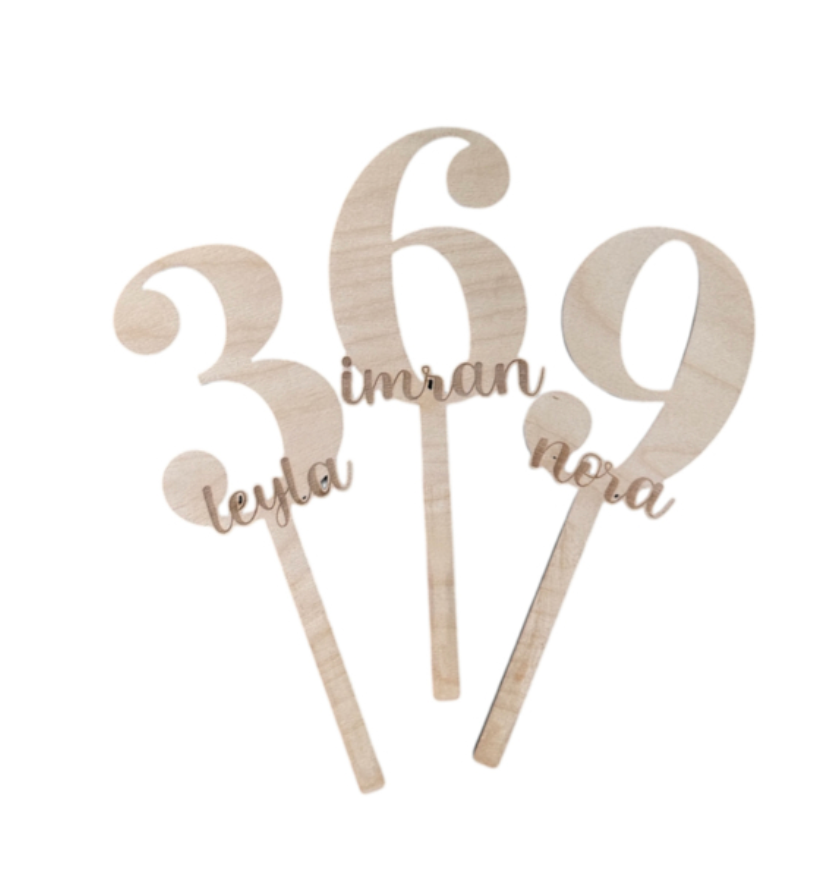 Maak jouw taart het stralende middelpunt van het feest met deze stijlvolle houten taarttopper! De topper heeft de vorm van een cijfer en wordt gegraveerd met de naam van jouw keuze – perfect voor verjaardagen, jubilea of andere mijlpalen.