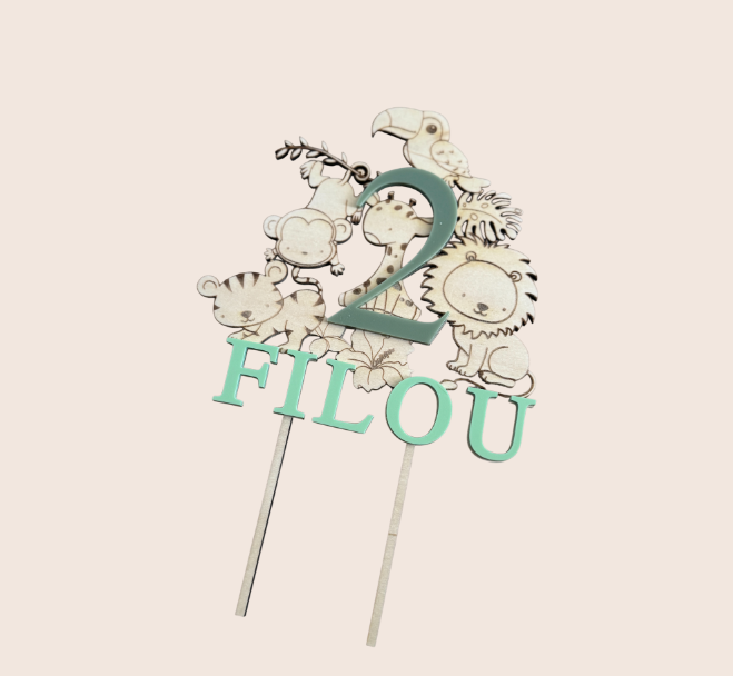 Geef je taart een vrolijke en persoonlijke uitstraling met deze houten taarttopper met jungle dieren. De topper wordt volledig gepersonaliseerd met de naam en leeftijd van je kind in 3D acryl, uitgevoerd in lichtblauw en zilveren glitter. Een perfecte decoratie voor verjaardagen, junglethemafeestjes of andere feestelijke momenten.