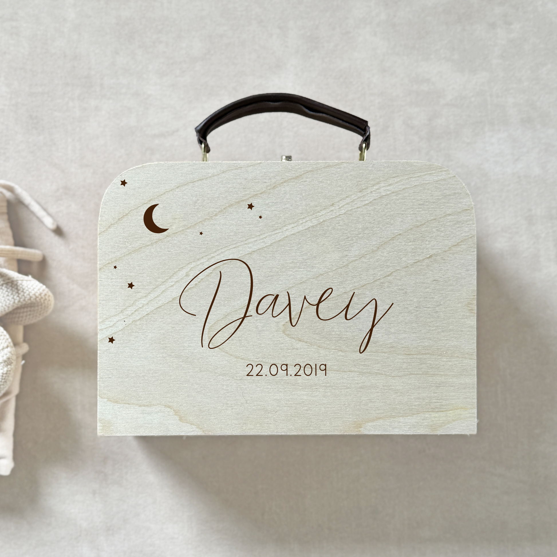 π Dit koffertje heeft een dromerig ontwerp met sterren en een maan, de naam en geboortedatum.